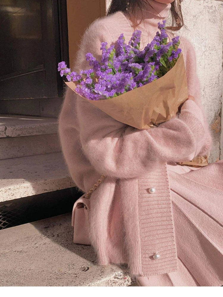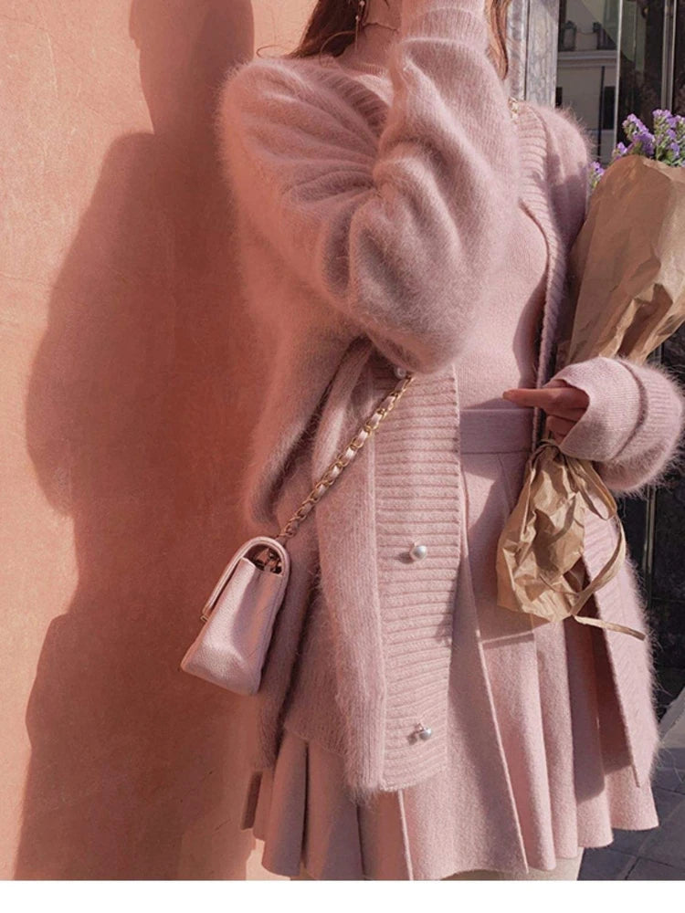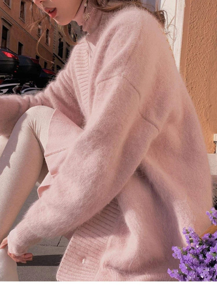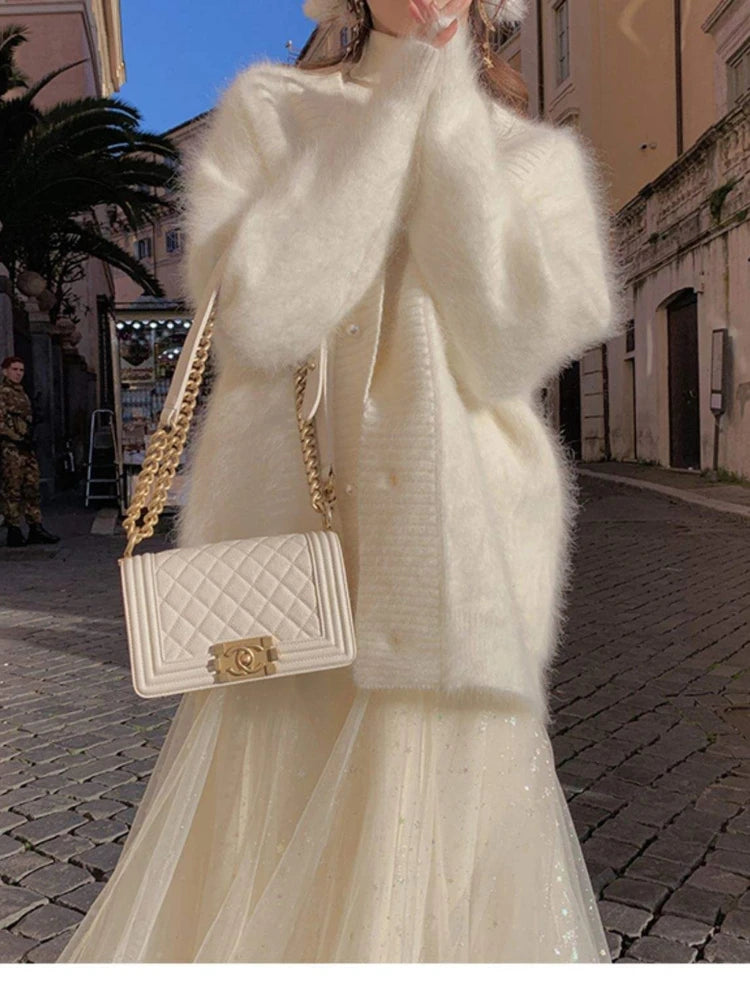 High Quality Women's Mink Cashmere Cardigan Sweater Coat Korean Autumn Fashion V-Neck Knitted Mohair Thick Loose Sweater Coat