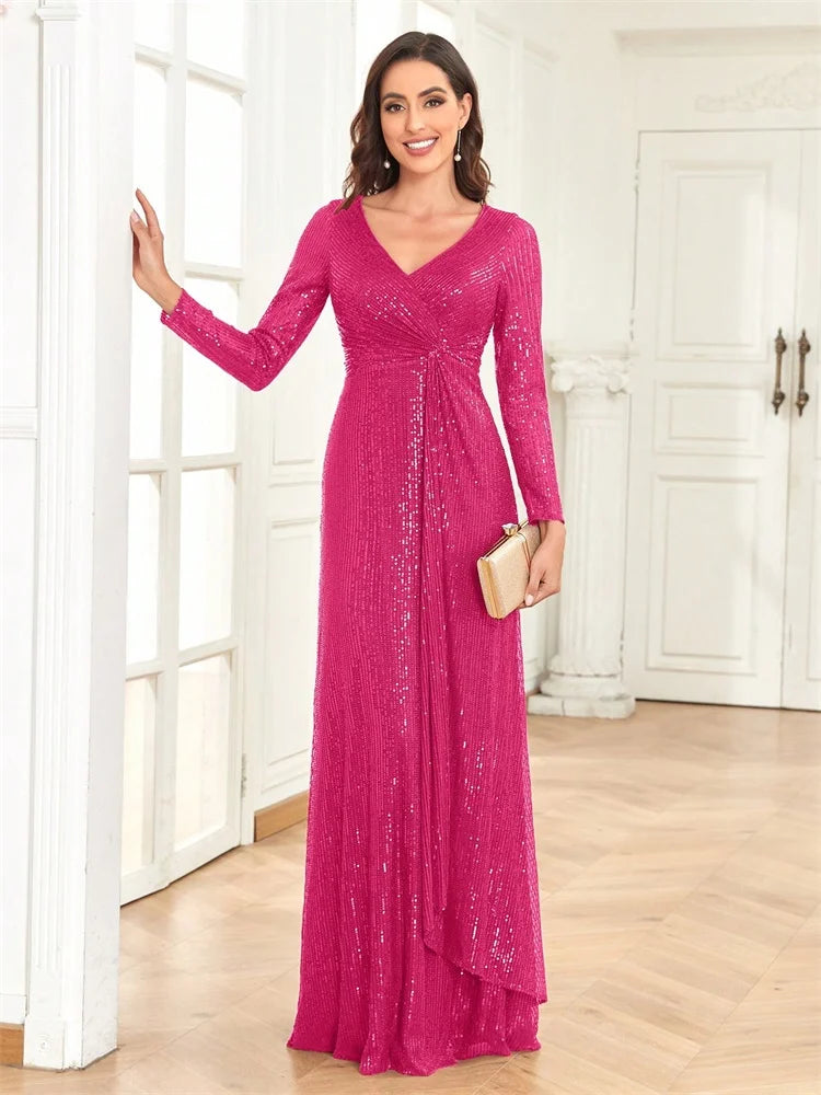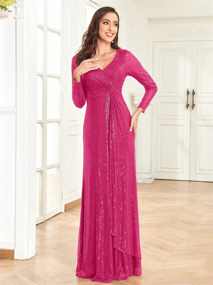 Luxury Floor Length V-Neck Evening Dresses Women Elegant Party Maxi Dress Sequin Long Sleeves Prom Cocktail Dress Gowns
