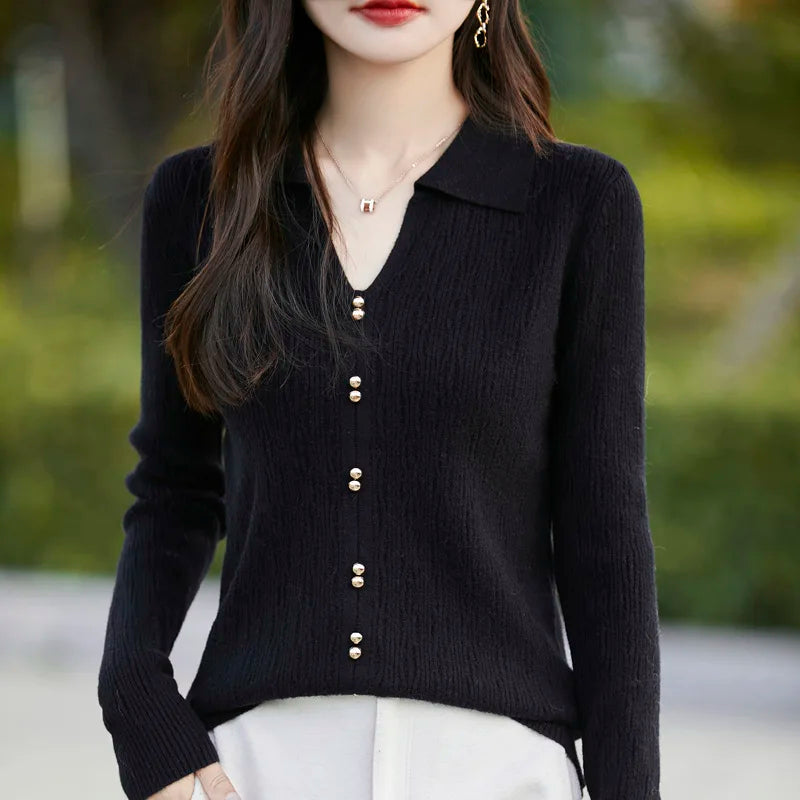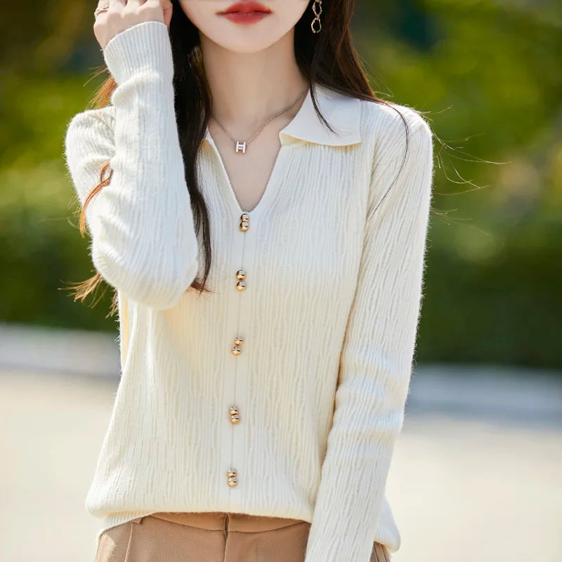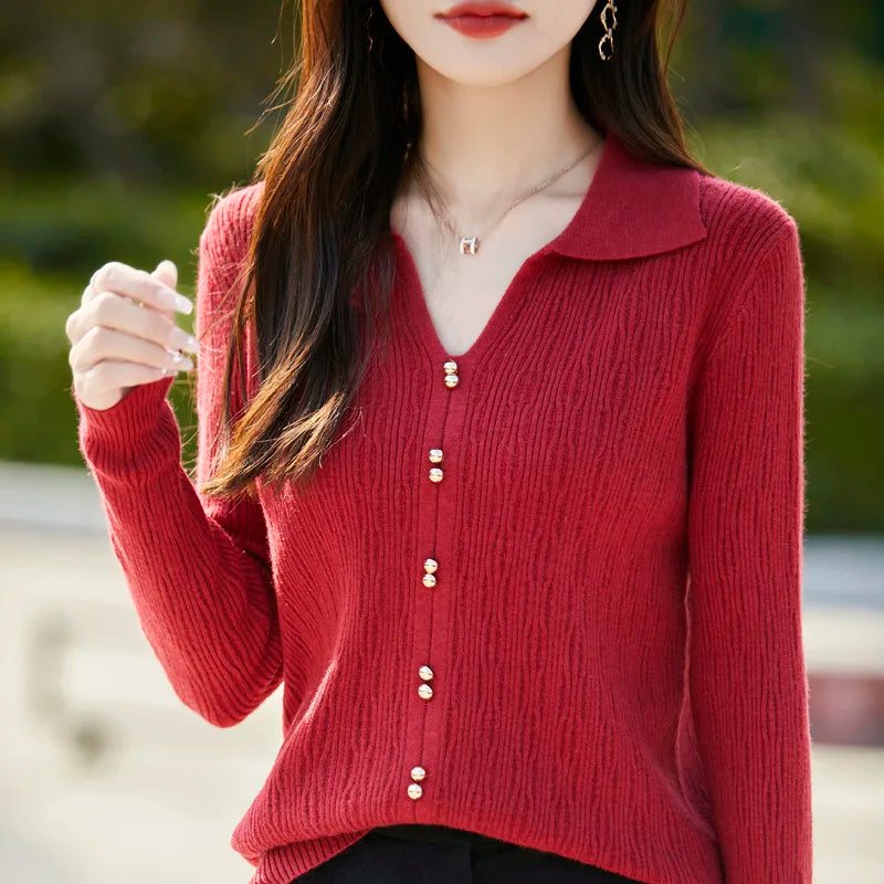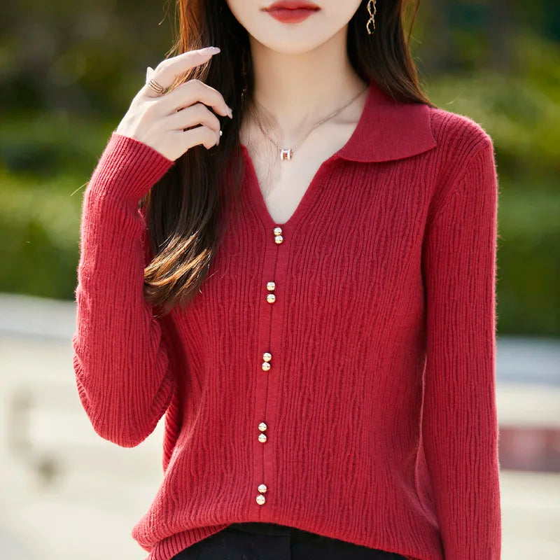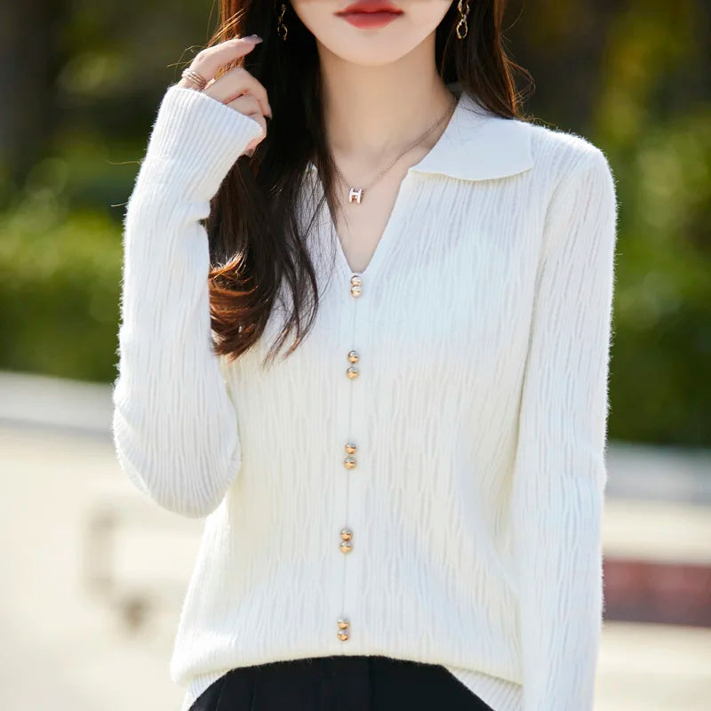 Spring Autumn Women Fine Merino Wool Sweater Polo V-neck Warm Pullover Hollow Pattern Fake Cardigan Knitwear Bottoming Tops