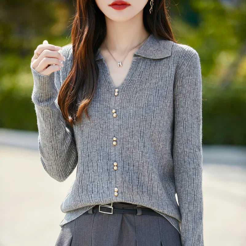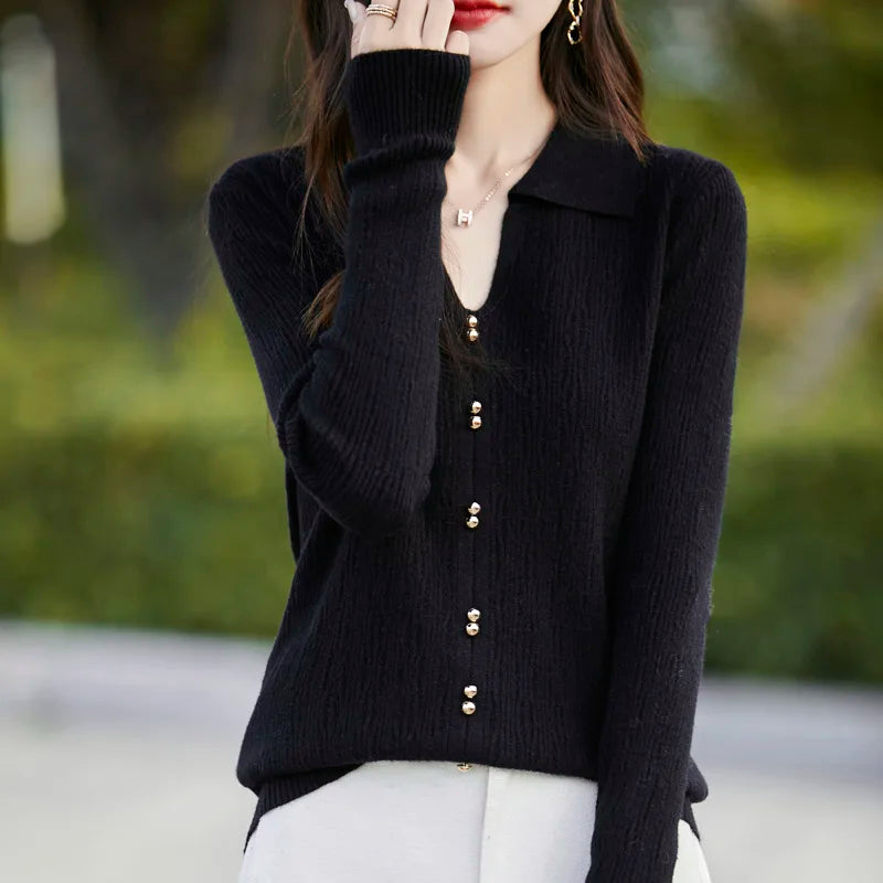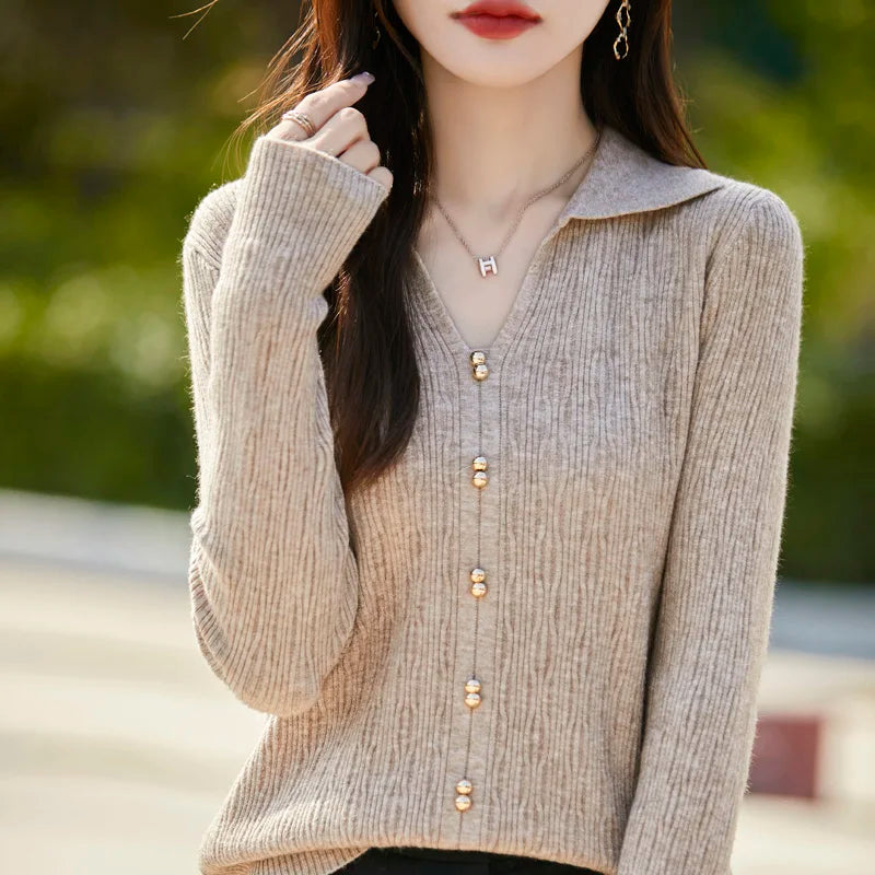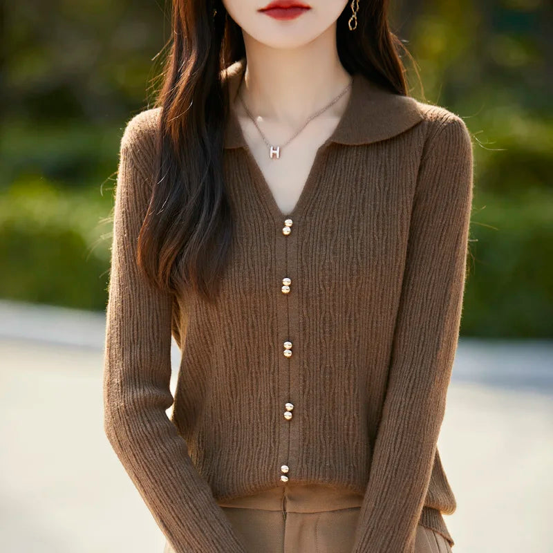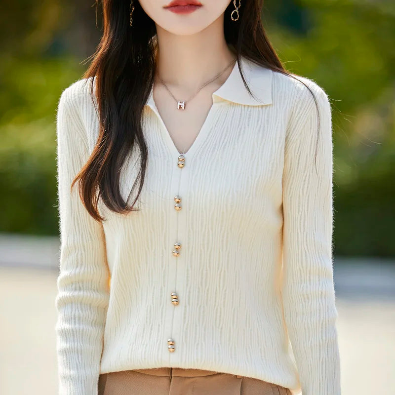 Spring Autumn Women Fine Merino Wool Sweater Polo V-neck Warm Pullover Hollow Pattern Fake Cardigan Knitwear Bottoming Tops